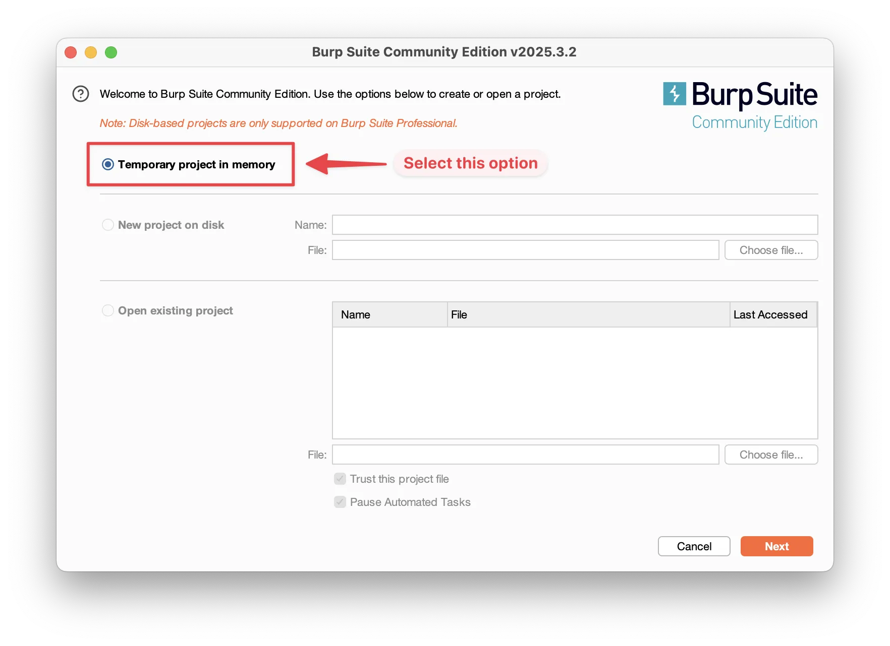 When prompted, select Temporary Project and click Start Burp with the default settings.