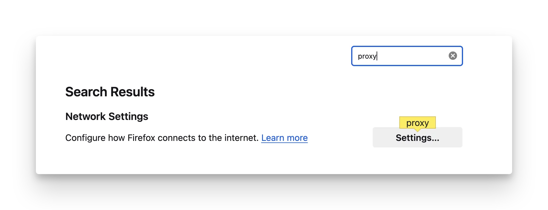 - Search for "proxy" and click on Settings... in the Network Settings section.