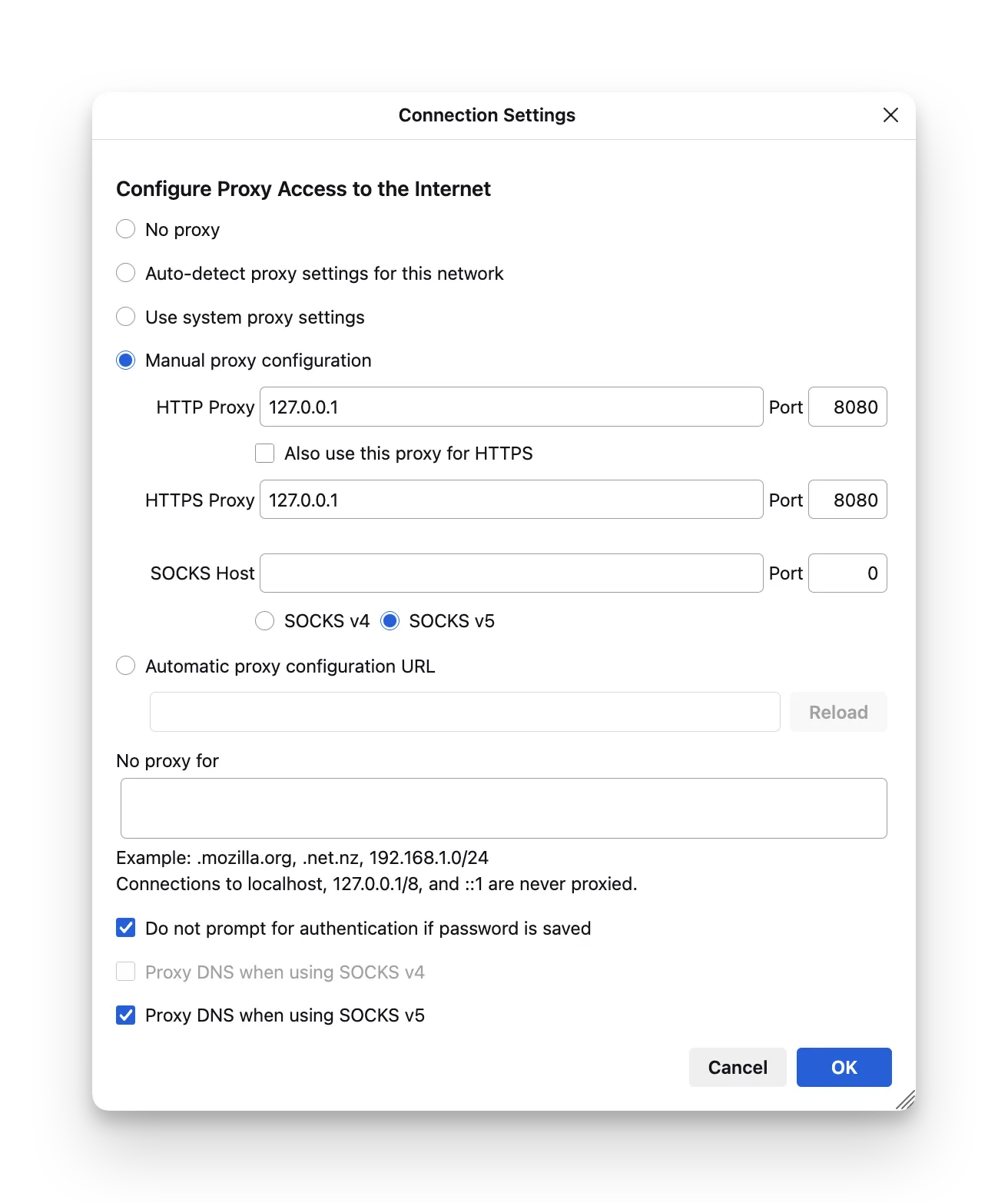 - Choose Manual proxy configuration and enter: