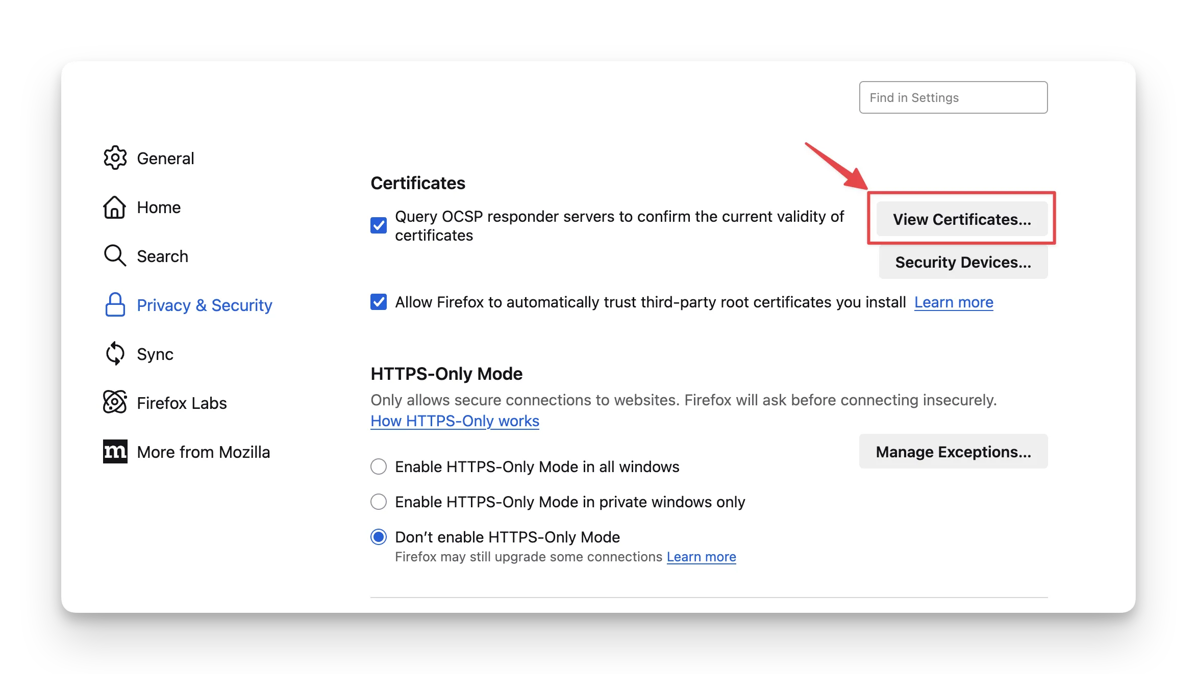 - Go to Firefox settings → Privacy & Security → Certificates → View Certificates. (or Search for “certificates”)