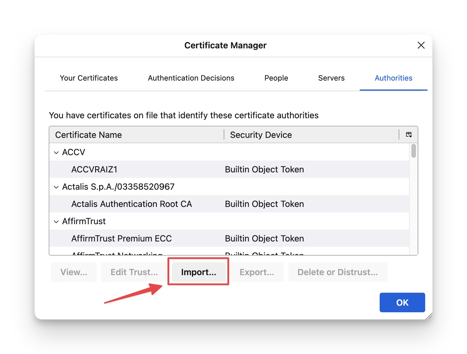 - Import the CA certificate under the Authorities tab and allow it to identify websites.