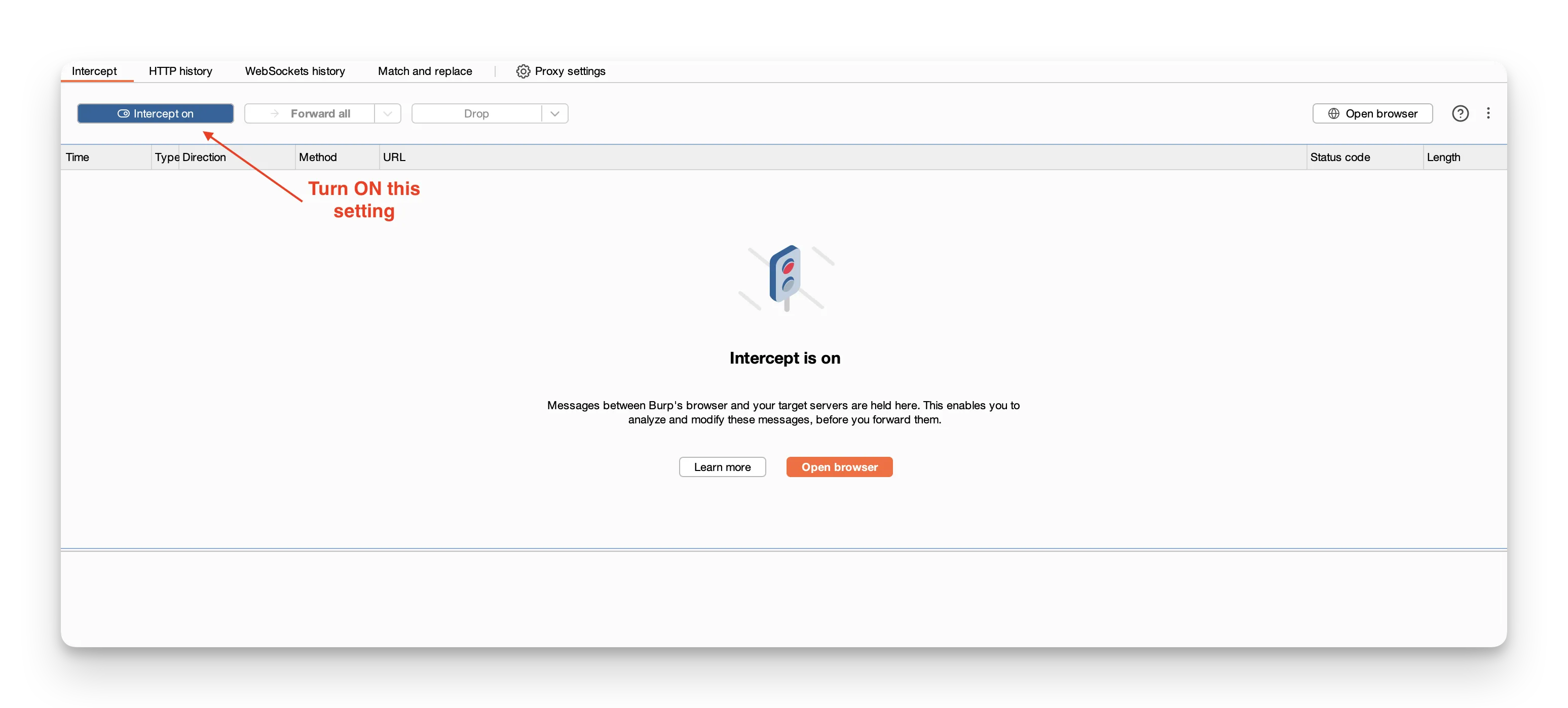 Check that the Intercept is on button in Burp’s Proxy tab is highlighted.