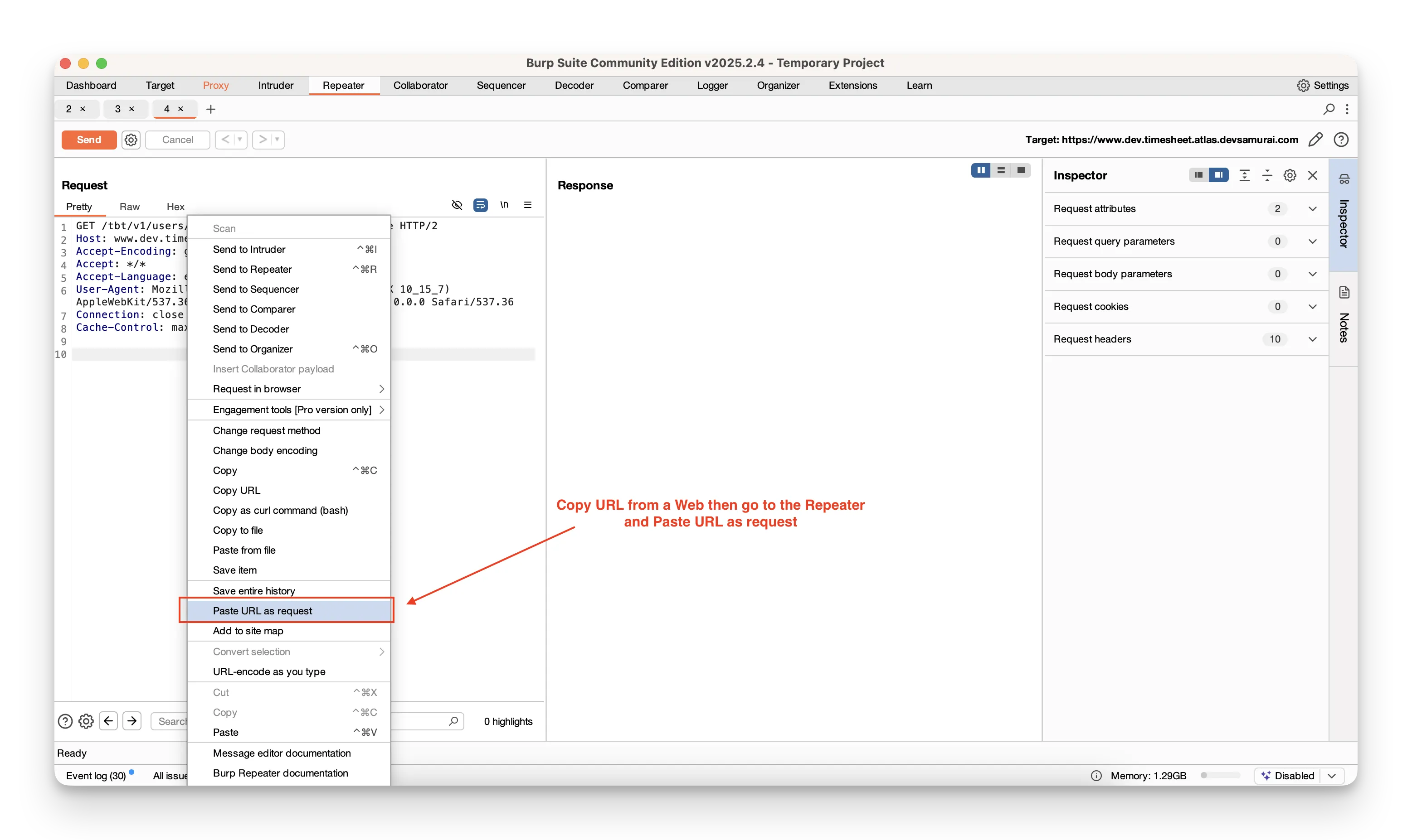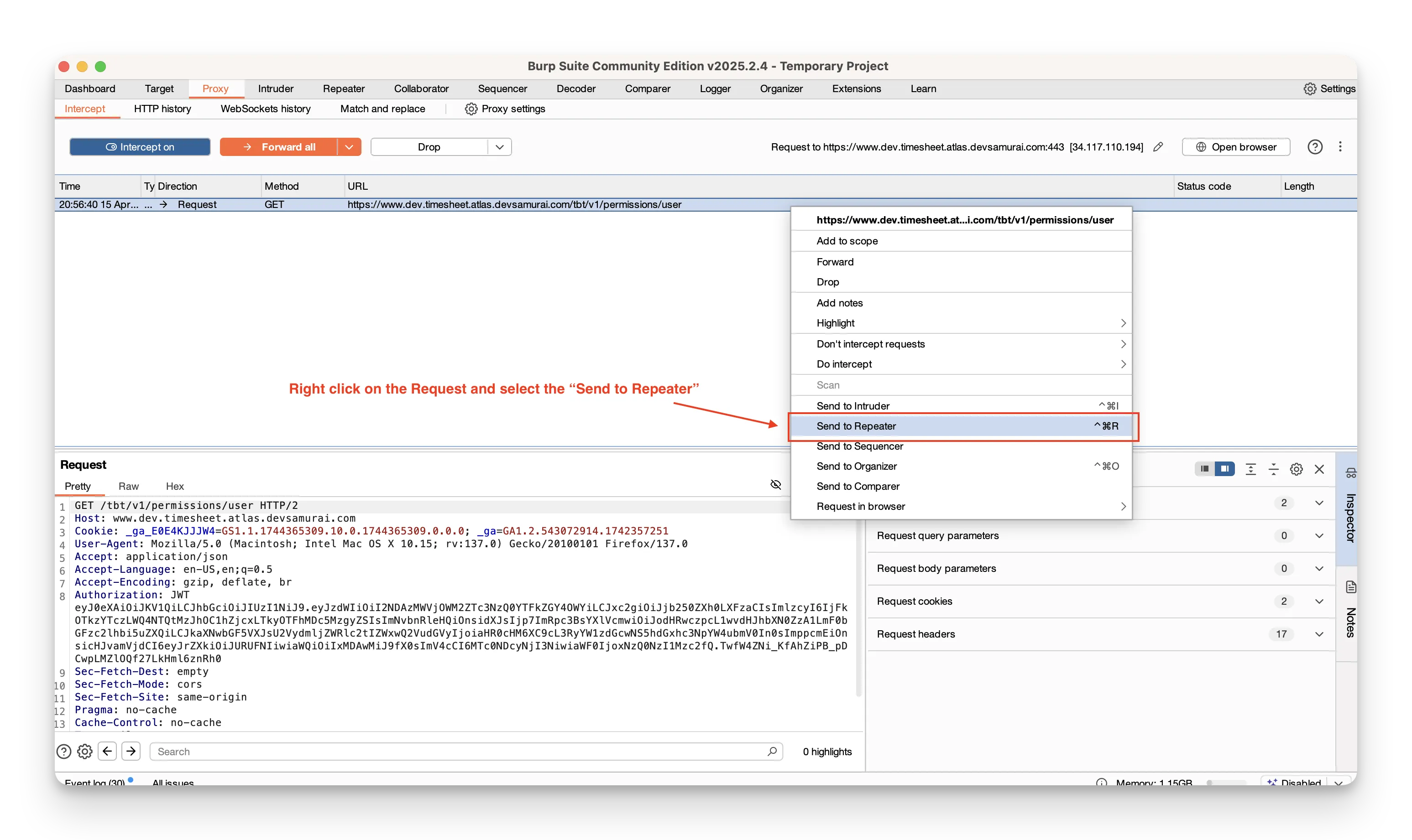 - In Proxy → HTTP history, right‑click the request you want to explore and choose Send to Repeater.
