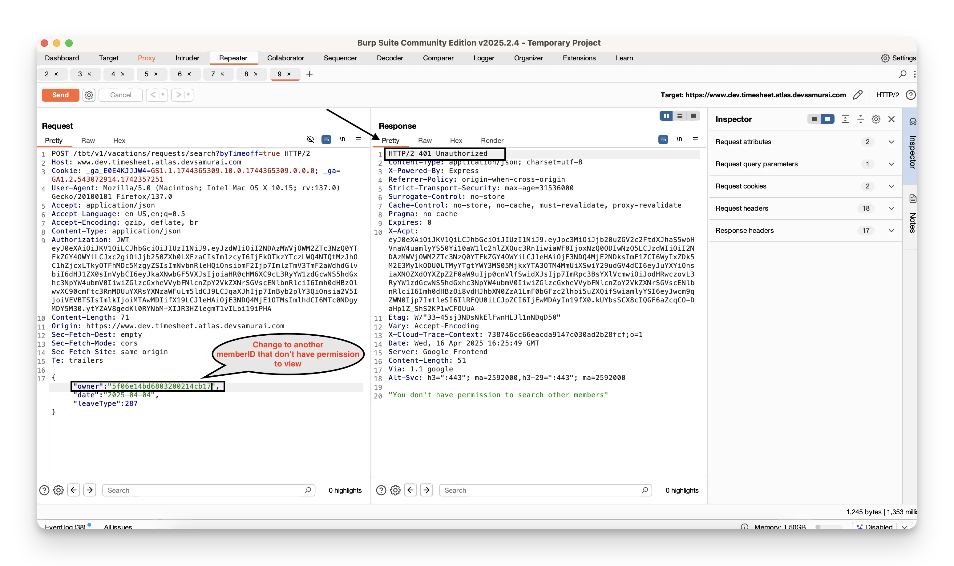 then change the memberID value in the query string to an ID you shouldn’t normally access. Observe whether the server blocks the request or leaks data.