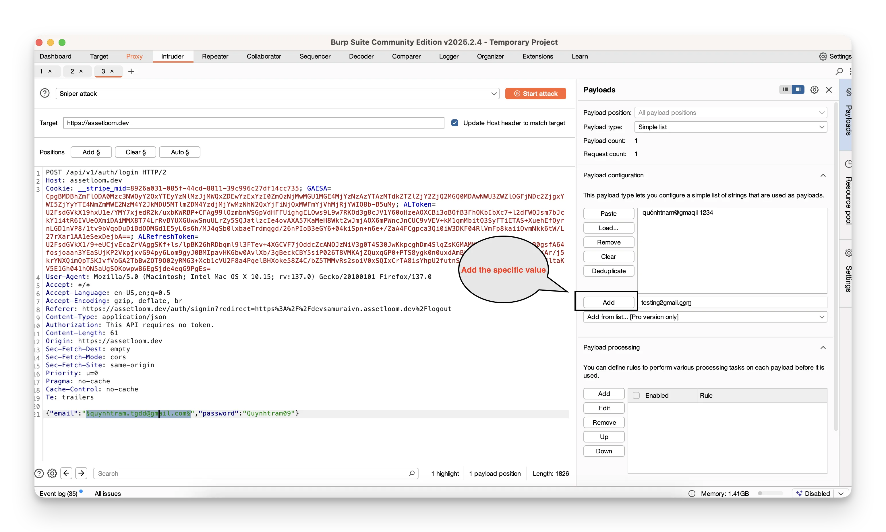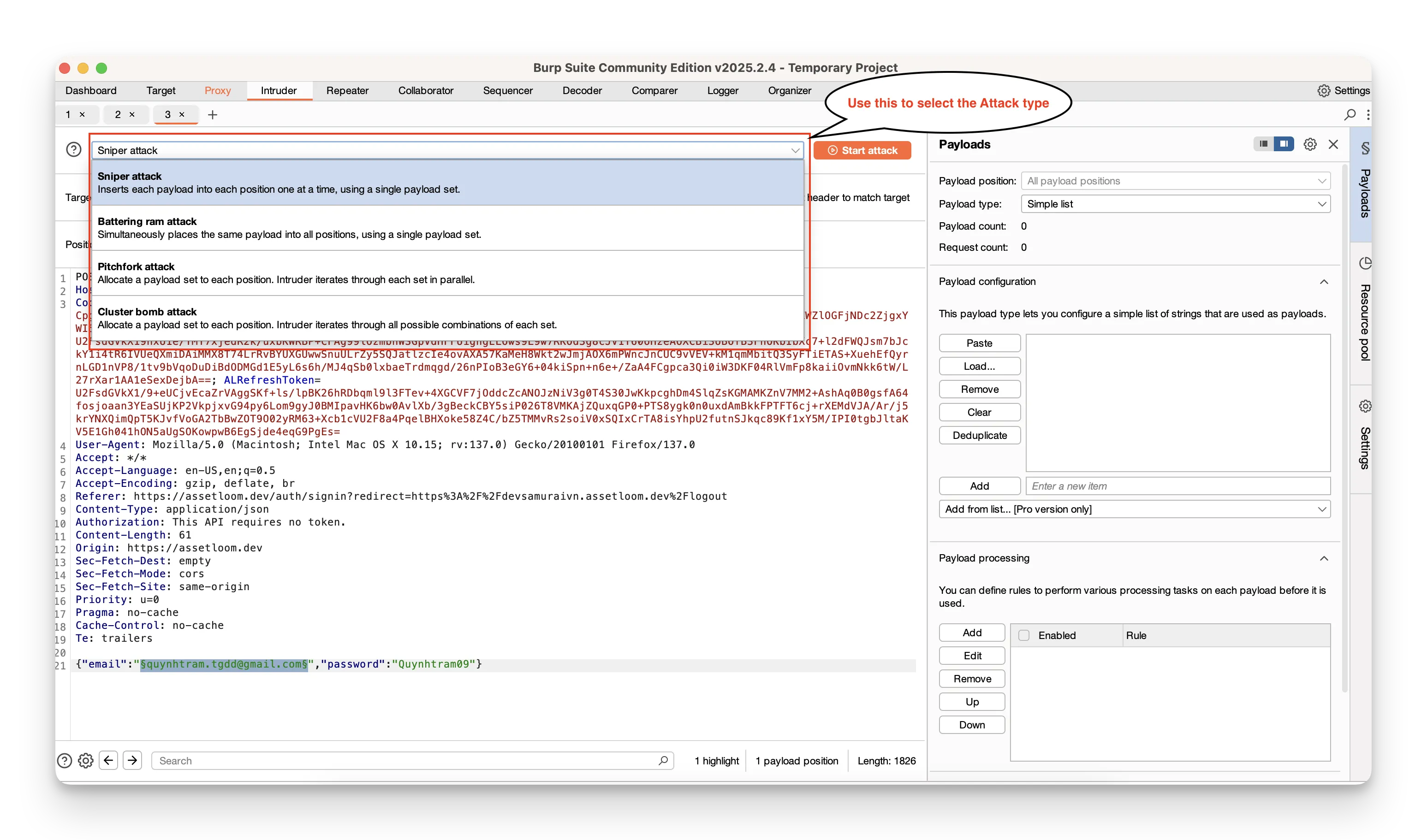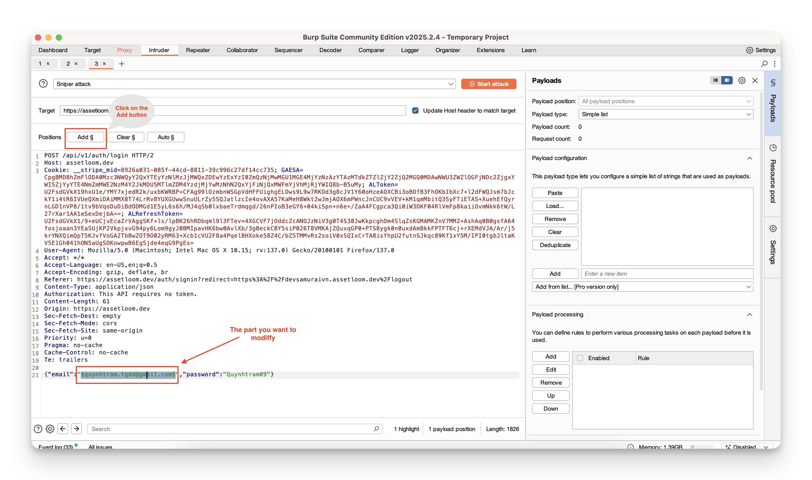 - Switch to the Intruder tab. In Positions, highlight the parts you want to vary—usually the username and password fields—and click Add around them.