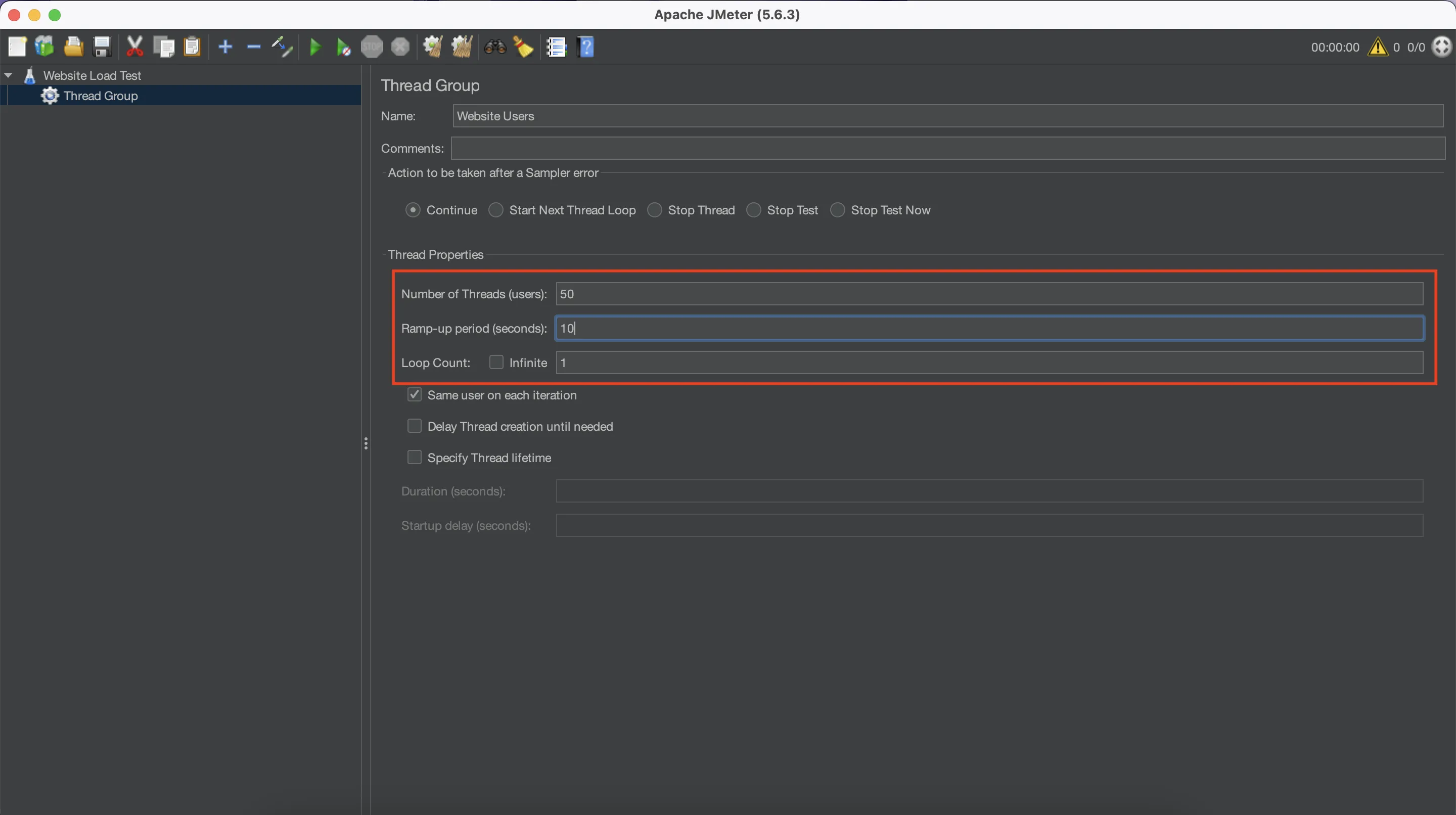 Ready for Load: Once the 1-user test works, change the Thread Group back to 50 users, 10 seconds ramp-up, 1 loop.