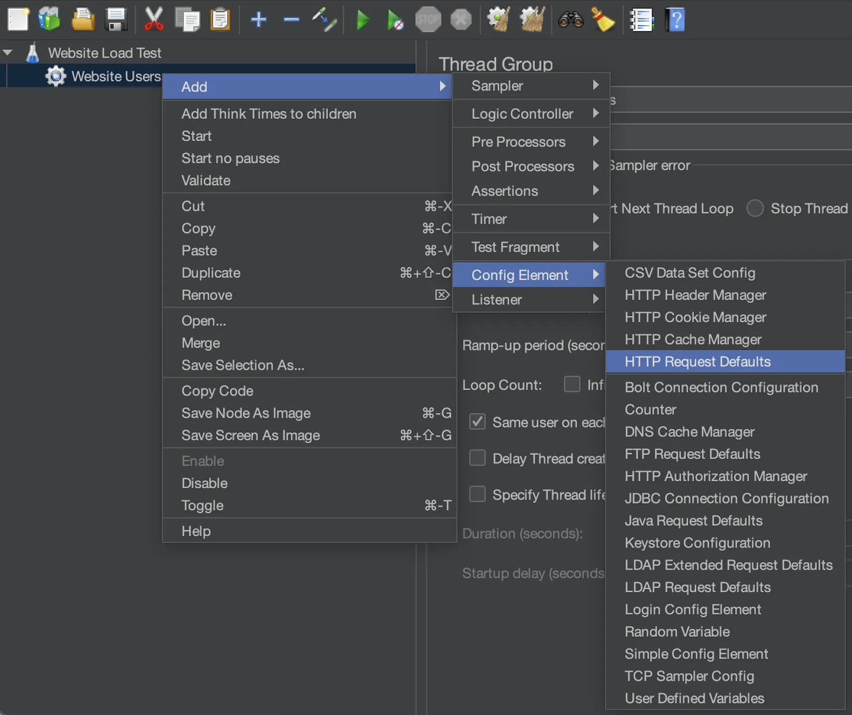 - Add HTTP Request Defaults (Good Practice): Right-click "Website Users" → Add → Config Element → HTTP Request Defaults.
