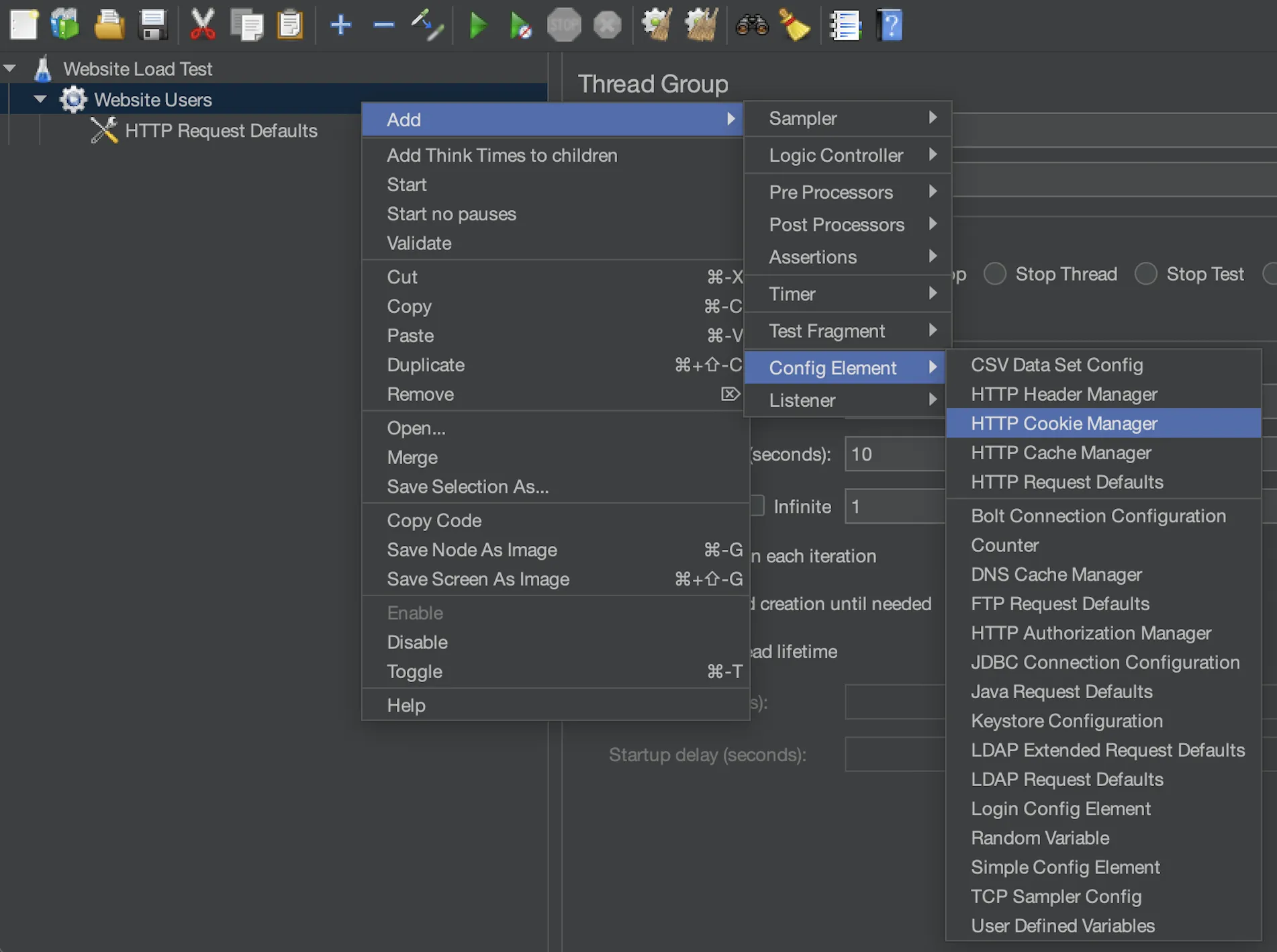 - Add an HTTP Cookie Manager (Essential for Web): Right-click "Website Users" → Add → Config Element → HTTP Cookie Manager.