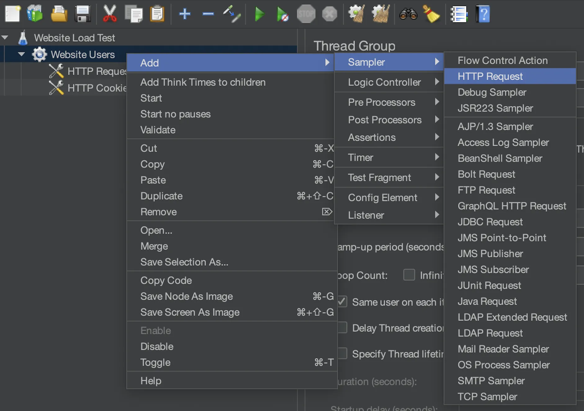 - Add a Thread Group: Right-click "Test Plan" → Add → Threads (Users) → Thread Group.