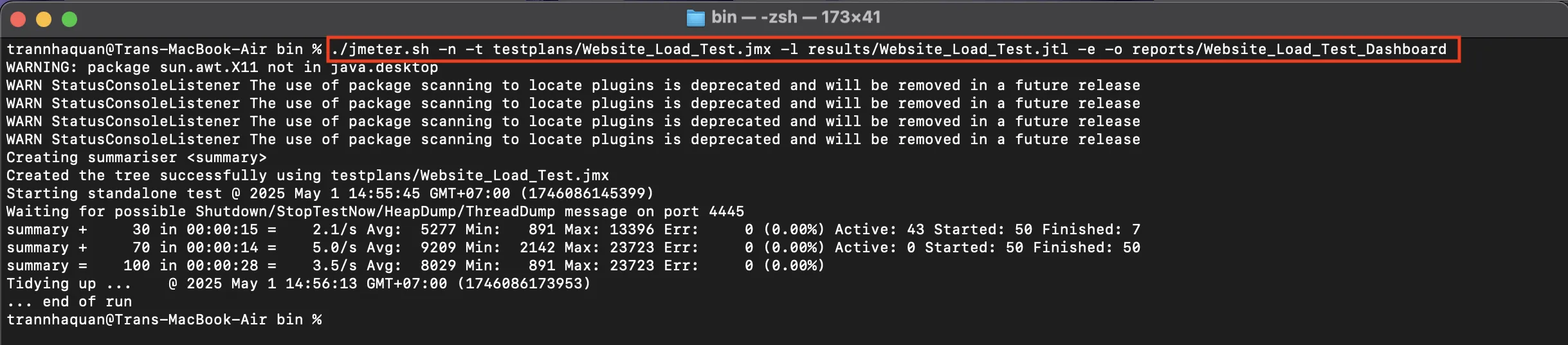 -e -o: Generate an HTML Dashboard report from the .jtl file after the test runs. Specify an empty directory for the dashboard output.