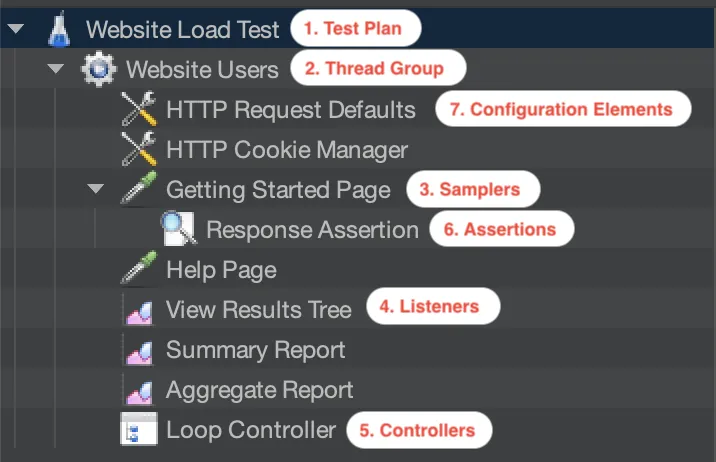 JMeter test plans are built like a tree structure. Let’s break down the key components you'll work with: